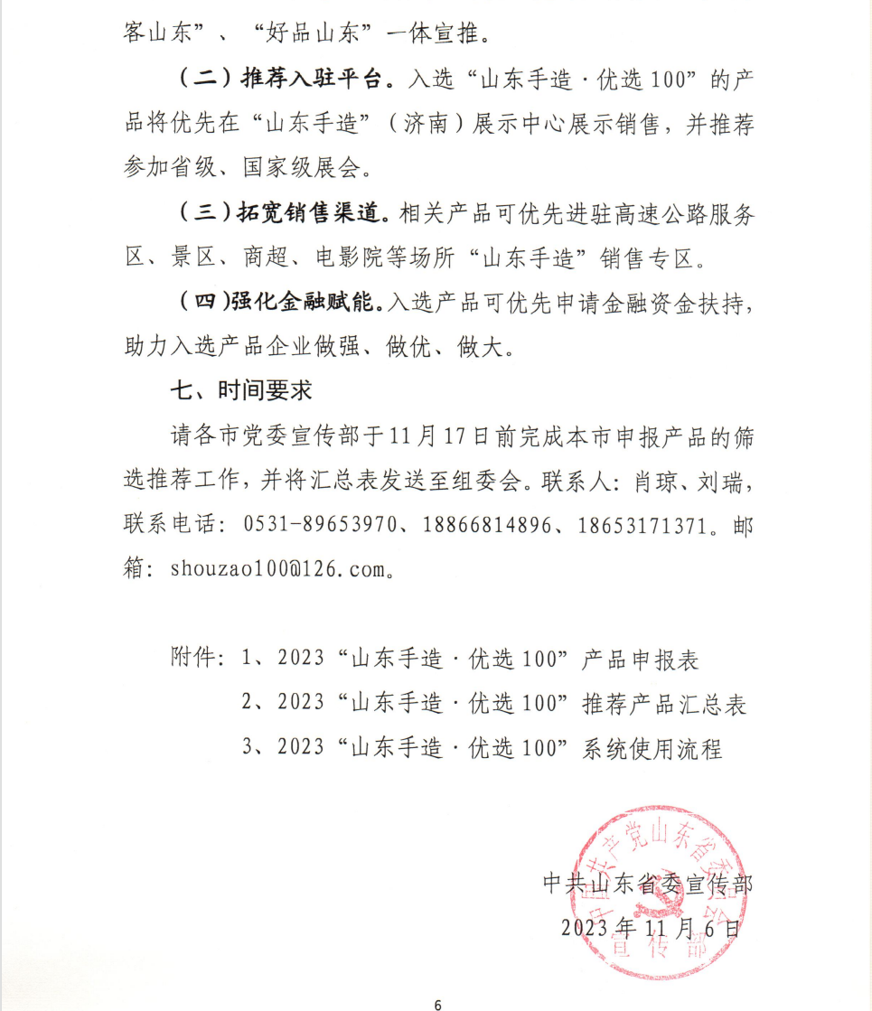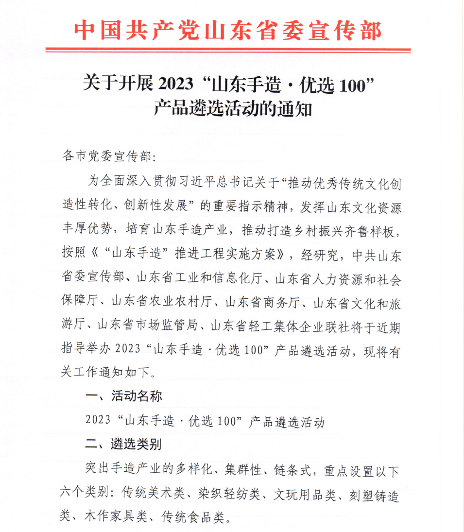 據(jù)了解,此次活動(dòng)評(píng)選是由山東省宣傳部2023年11月份發(fā)起,由山東省工業(yè)和信息化廳、山東省人力資源和社會(huì)保障廳、山東省農(nóng)業(yè)農(nóng)村廳、山東省商務(wù)廳、山東省文化和旅游廳、山東省市場監(jiān)督局、山東省輕工集體企業(yè)聯(lián)合指導(dǎo)開展的2023“山東手造·優(yōu)選100”產(chǎn)品遴選活動(dòng),先后經(jīng)過企業(yè)申報(bào)、專家評(píng)審、確定發(fā)布三個(gè)階段,旨在提升品牌價(jià)值,入選產(chǎn)品將納入“山東手造”品牌體系,可統(tǒng)一食用品牌標(biāo)識(shí),參與“好客山東”、“好品山東”的一體宣推。