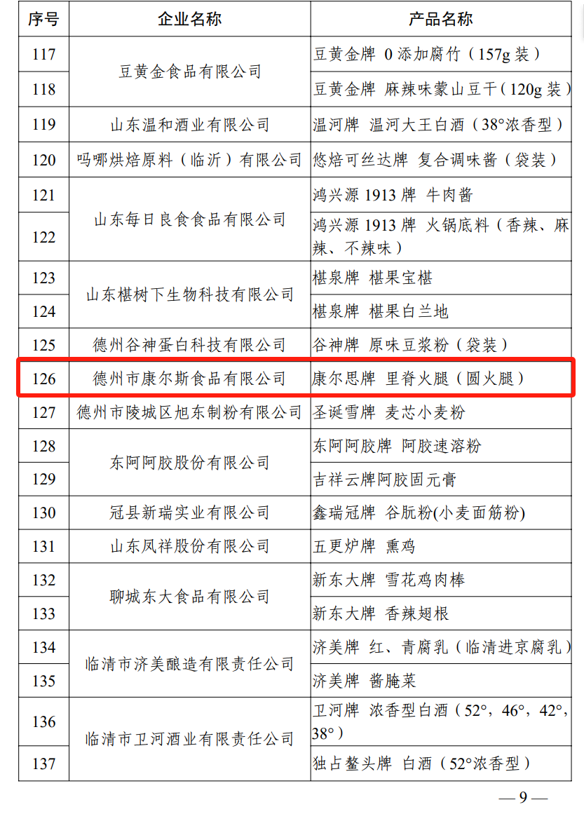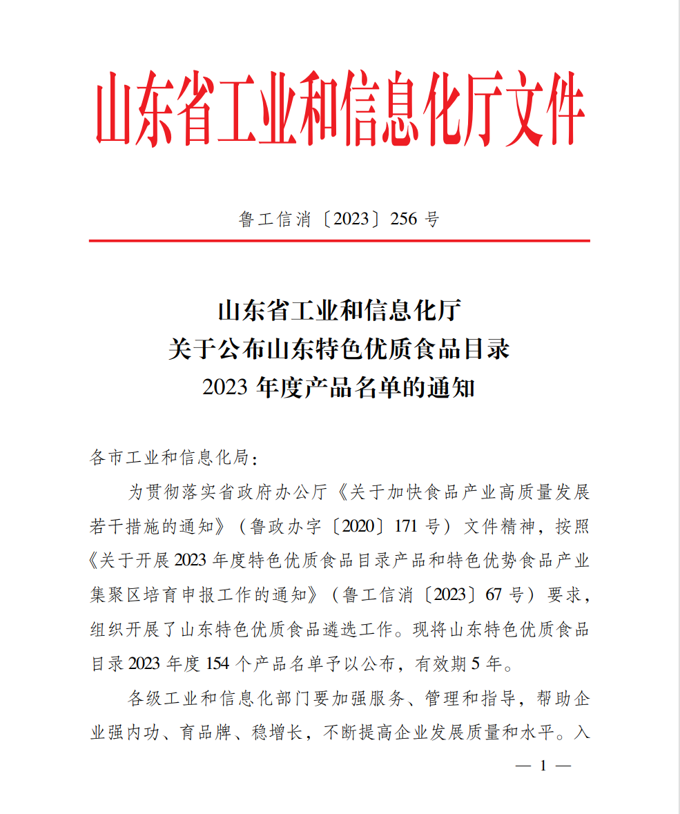 2023年12月12日,根據(jù)山東省工業(yè)和信息化廳魯工信消【2023】256號(hào)文件消息,公開發(fā)布了《關(guān)于公布山東特色優(yōu)質(zhì)食品目錄2023年度產(chǎn)品名單的通知》,我公司產(chǎn)品——“里脊火腿”被入選名錄其中,全省僅有154個(gè)產(chǎn)品入選,有效期為5年。